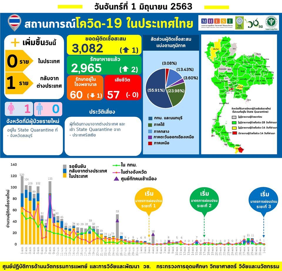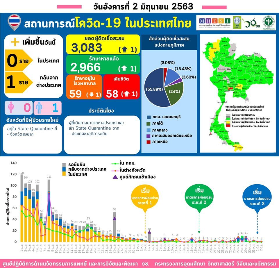 สถานการณ์ของโรคติดเชื้อไวรัสโคโรนา 2019 (COVID-19) ในประเทศไทย ณ วันที่ 2 มิถุนายน 2563 มีรายงานผู้ติดเชื้อสะสม 3,083 ราย ใน 68 จังหวัด (เพิ่มขึ้น 1 ราย) ไม่มีผู้ติดเชื้อรายใหม่จากภายในประเทศ (ติดต่อกันเป็นวันที่ 8) มีผู้ติดเชื้อในกลุ่มผู้ที่กลับจากต่างประเทศใน State quarantine เพิ่มขึ้น 1 ราย เสียชีวิตรวม 58 ราย (เพิ่มขึ้น 1 ราย) รักษาหายป่วยแล้ว 2,966 ราย (96.21%) (เพิ่มขึ้น 1 ราย) ผู้ติดเชื้อรายใหม่ที่เพิ่มขึ้นในวันนี้ 1 ราย เป็นผู้ที่เดินทางมาจากต่างประเทศ (ประเทศซาอุดิอาระเบีย) อยู่ใน State quarantine โดยเข้ารับการรักษาที่จังหวัดสงขลา