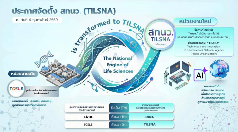 ประกาศจัดตั้ง สทนว. (TILSNA) ณ วันที่ 6 กุมภาพันธ์ 2569 ชื่อภาษาไทย "สทนว." สำนักงานเทคโนโลยีและนวัตกรรมด้านชีววิทยาศาสตร์ (องค์การมหาชน)