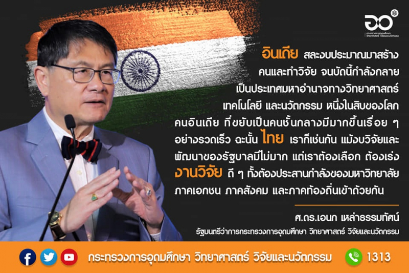 "อินเดีย สละงบประมาณมาสร้างคนและทำวิจัย จนบัดนี้กำลังกลายเป็นประเทศมหาอำนาจทางวิทยาศาสตร์ เทคโนโลยี และนวัตกรรม 1 ใน 10 ของโลก คนอินเดียที่ขยับเป็นคนชั้นกลางมีมากขึ้นเรื่อยๆ อย่างรวดเร็ว ฉะนั้นไทยเราก็เช่นกัน แม้งบวิจัยและพัฒนาของรัฐบาลมีไม่มากแต่เราต้องเลือกต้องเร่งงานวิจัยดีๆ ทั้งต้องประสานกำลังของมหาวิทยาลัยเอกชน ภาคสังคม และภาคท้องถิ่นเข้าด้วยกัน"