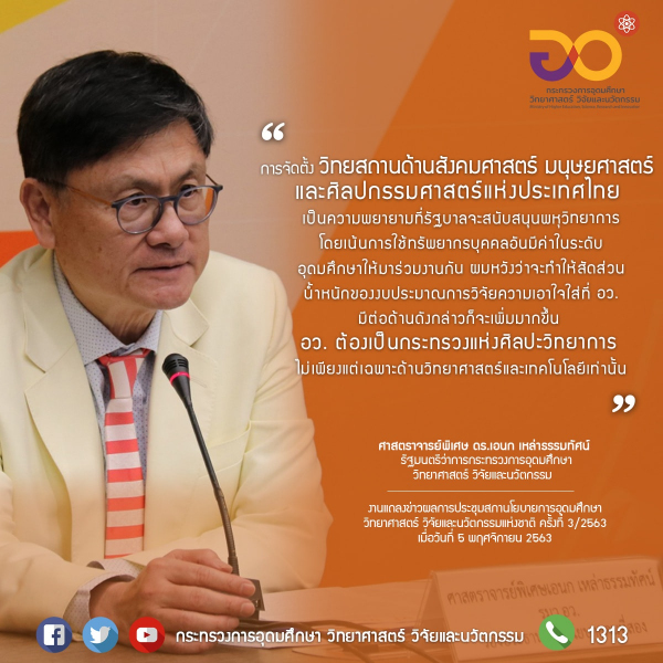 "การจัดตั้งวิทยสถานด้านสังคมศาสตร์ มนุษยศาสตร์ และศิลปกรรมศาสตร์แห่งประเทศไทย เป็นความพยายามที่รัฐบาลจะสนับสนุนพหุวิทยาการ โดยเน้นการใช้ทรัพยากรบุคคลอันมีค่าในระดับอุดมศึกษาให้มาร่วมงานกัน ผมหวังว่าจะทำให้สัดส่วน น้ำหนักของงบประมาณการวิจัยความเอาใจใส่ที่ อว. มีต่อด้านดังกล่าวก็จะเพิ่มมากขึ้น อว. ต้องเป็นกระทรวงแห่งศิลปะวิทยาการ ไม่เพียงแต่ด้านวิทยาศาสตร์และเทคโนโลยีเท่านั้น "