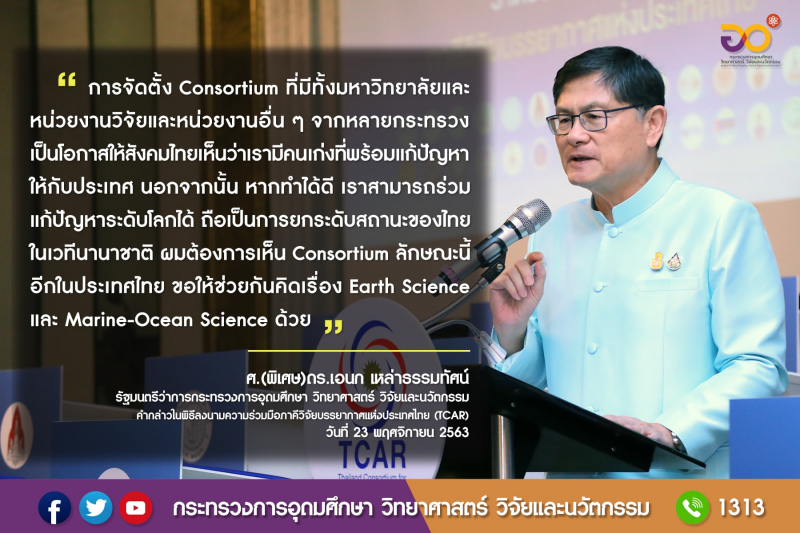"การจัดตั้ง Consortium ที่มีทั้งมหาวิทยาลัยและหน่วยงานวิจัยและหน่วยงานอื่นๆ จากหลายกระทรวงเป็นโอกาสให้สังคมไทยเห็นว่าเรามีคนเก่งที่พร้อมแก้ปัญหาให้กับประเทศ นอกจากนั้น หากทำได้ดี เราสามารถร่วมแก้ปัญหาระดับโลกได้ ถือเป็นการยกระดับสถานะของไทยในเวทีนานาชาติ ผมต้องการเห็น Consortium ลักษณะนี้อีกในประเทศไทย ขอให้ช่วยกันคิดเรื่อง Earth Science และ Marine-Ocean Science ด้วย"