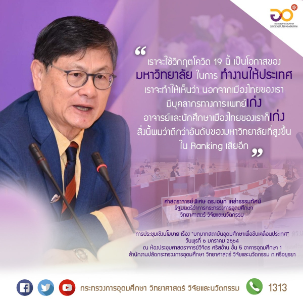 " เราจะใช้วิกฤตโควิด 19 นี้ เป็นโอกาสของมหาวิทยาลัย ในการทำงานให้ประเทศ.. เราจะทำให้เห็นว่า นอกจากเมืองไทยของเรามีบุคลากรทางการแพทย์เก่ง อาจารย์และนักศึกษาเมืองไทยของเราก็เก่ง สิ่งนี้ผมว่าดีกว่าอันดับของมหาวิทยาลัยที่สูงขึ้นใน Ranking เสียอีก "