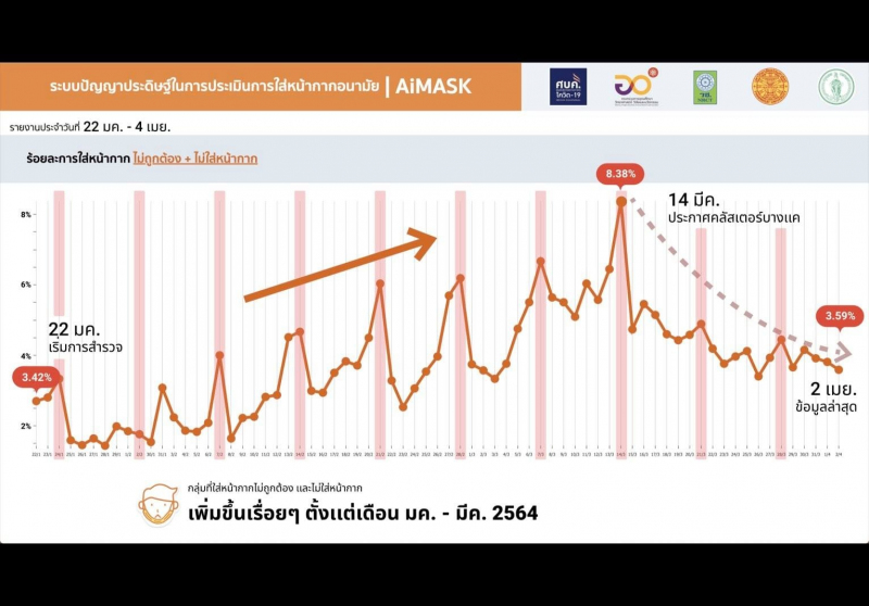 (8 เมษายน 2564) ศาสตราจารย์ ดร. นายแพทย์สิริฤกษ์ ทรงศิวิไล ปลัดกระทรวงการอุดมศึกษา วิทยาศาสตร์ วิจัยและนวัตกรรม (อว.) เผยว่าจากการที่ อว. ติดตามประเมินการใส่หน้ากากอนามัยโดยใช้ระบบปัญญาประดิษฐ์ (เอไอ) มาตั้งแต่เดือนมกราคมเป็นต้นมานั้น ข้อมูลบ่งชัดเจนว่า คนกรุงเทพฯ ได้การ์ดตกมาเรื่อยๆ ในช่วง 3 เดือนนี้ โดยในวันที่ 22 มกราคม 2564 ที่เริ่มใช้ระบบเอไอนั้น มีผู้ที่ไม่ใส่หน้ากากอนามัยหรือใส่ไม่ถูกต้องเพียง 3.42% แต่เมื่อติดตามต่อเนื่องทุกวันพบอัตราการไม่ใส่หรือใส่หน้ากากไม่ถูกต้องเพิ่มสูงขึ้นเป็นลำดับ จนสูงถึง 8.38% (เพิ่มขึ้นถึง 2.5 เท่า) เมื่อวันที่ 14 มีนาคม 2564 ซึ่งเป็นวันที่มีการประกาศการระบาดจากคลัสเตอร์ตลาดบางแค