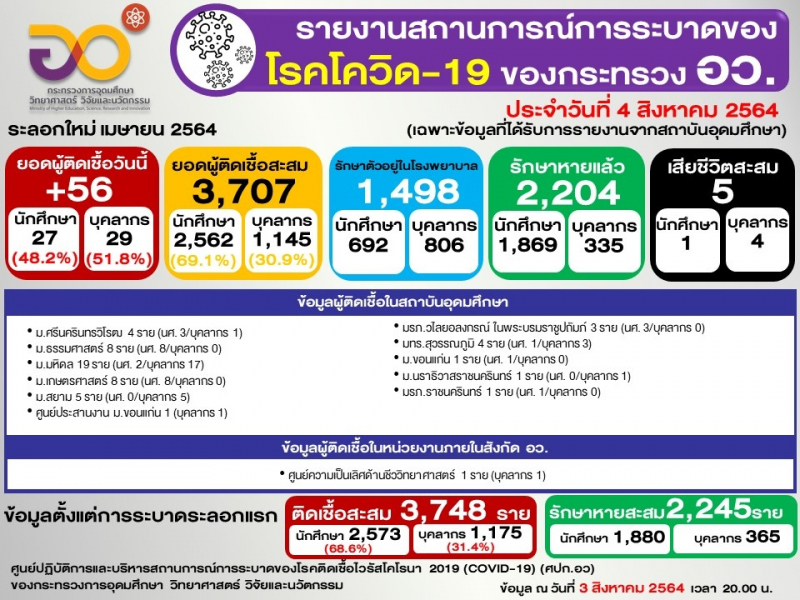 ข้อมูล : ศูนย์ปฏิบัติการและบริหารสถานการณ์การระบาดของโรคติดเชื้อไวรัสโคโรนา 2019 (COVID-19) (ศปก.อว.)