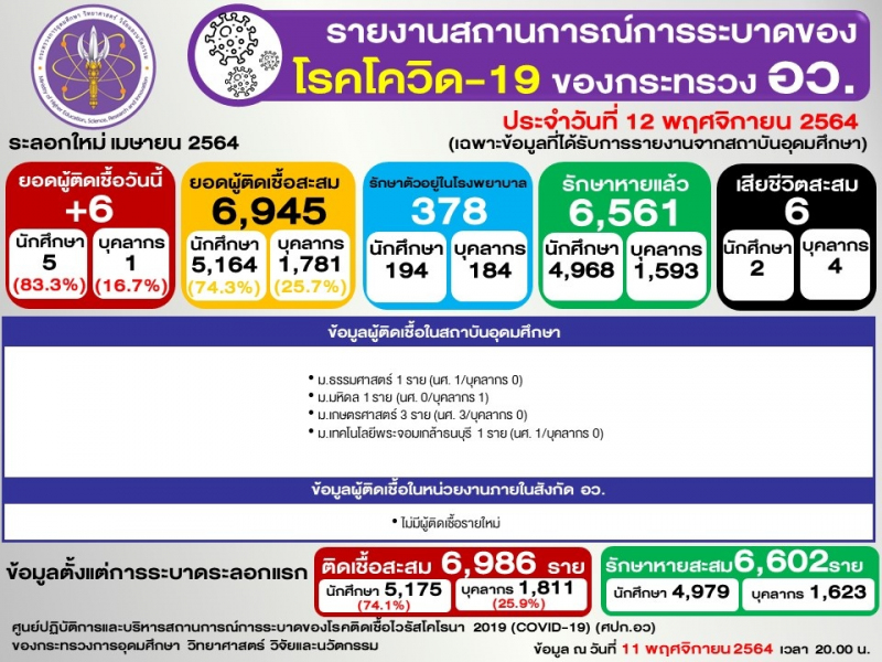 ข้อมูล : ศูนย์ปฏิบัติการและบริหารสถานการณ์การระบาดของโรคติดเชื้อไวรัสโคโรนา 2019 (COVID-19) (ศปก.อว.)