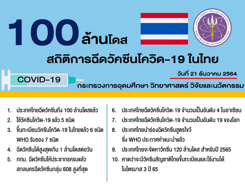 (21 ธันวาคม 2564) กระทรวงการอุดมศึกษา วิทยาศาสตร์ วิจัยและนวัตกรรม (อว.) เผยข้อมูลสถิติการฉีดวัคซีนโควิด-19 ของประเทศไทย ใช้เวลา 296 วัน ครบ 100 ล้านโดส โดยมีข้อมูลที่สำคัญดังนี้