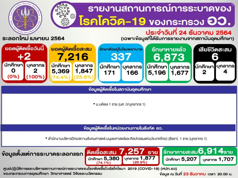 ข้อมูล : ศูนย์ปฏิบัติการและบริหารสถานการณ์การระบาดของโรคติดเชื้อไวรัสโคโรนา 2019 (COVID-19) (ศปก.อว.)
