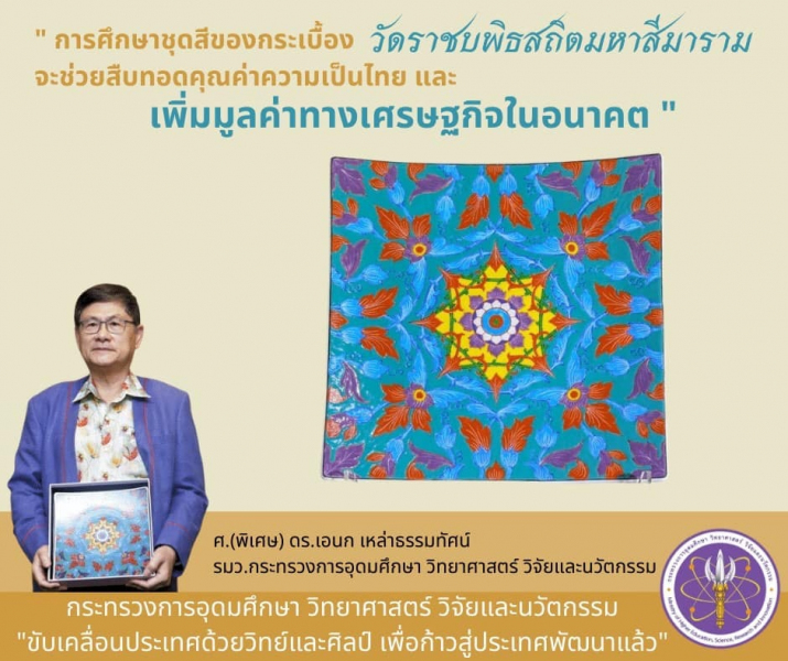 ดร.เอนก เหล่าธรรมทัศน์ รัฐมนตรีว่าการกระทรวงการอุดมศึกษา วิทยาศาสตร์ วิจัยและนวัตกรรม (รมว.อว.) กล่าวชื่นชม และให้กำลังใจ นักวิจัยเรื่อง "การศึกษาชุดสีของกระเบื้องวัดราชบพิธสถิตมหาสีมาราม เพื่อจัดทําชุดโครงสี ผ่านมุมมองการสร้างสรรค์ ผลงานศิลปะประยุกต์ และต้นแบบแพนโทน สําหรับการใช้งานด้านการออกแบบ ผลิตภัณฑ์ เคหะสถานและสิ่งทอ"