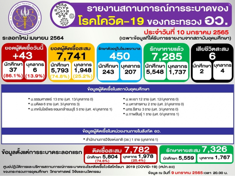 ข้อมูล : ศูนย์ปฏิบัติการและบริหารสถานการณ์การระบาดของโรคติดเชื้อไวรัสโคโรนา 2019 (COVID-19) (ศปก.อว.)