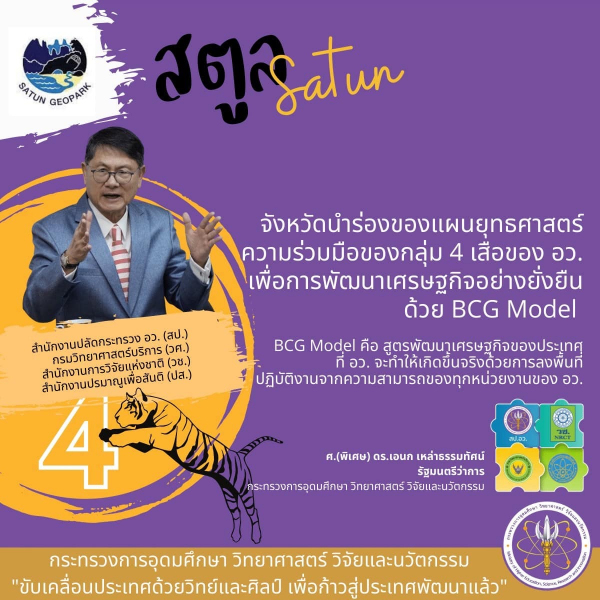 ผู้ว่าราชการจังหวัดสตูล นายเอกรัฐ หลีเส็น และ อธิการบดีมรภ.สงลา รศ.ดร.ทัศนา ศิริโชติ ขานรับนโยบาย และพร้อมร่วมดำเนินการทันที พร้อมกับบูรณาการกับหน่วยงานที่เกี่ยวทั้งหมด โดยเฉพาะการเข้ามามีร่วมในการพัฒนา “สตูลจีโอพาร์ค” อุทยานธรณีโลกให้เติบโตอย่างยั่งยืน โดยใช้องค์ความรู้ เทคโนโลยีและนวัตกรรมของ อว.