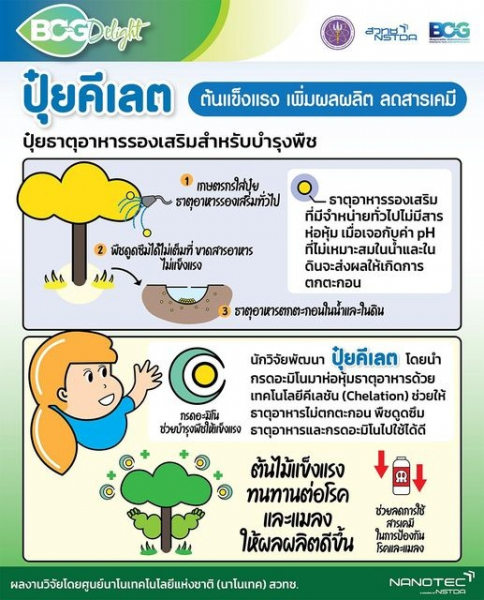 ต้นแข็งแรง เพิ่มผลผลิต ลดสารเคมี...ด้วย ‘นวัตกรรมปุ๋ยคีเลต’ นวัตกรรมห่อหุ้มปุ๋ยธาตุอาหารรองเสริมด้วยกรดอะมิโน ช่วยให้ปุ๋ยไม่ตกตะกอนในน้ำและในดิน ส่งผลให้พืชดูดซึมปุ๋ยไปใช้ได้เต็มที่ ลำต้นแข็งแรง ทนทานต่อโรคและแมลง