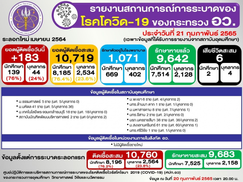 ข้อมูล : ศูนย์ปฏิบัติการและบริหารสถานการณ์การระบาดของโรคติดเชื้อไวรัสโคโรนา 2019 (COVID-19) (ศปก.อว.)