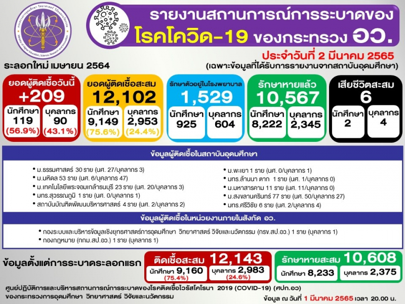 ข้อมูล : ศูนย์ปฏิบัติการและบริหารสถานการณ์การระบาดของโรคติดเชื้อไวรัสโคโรนา 2019 (COVID-19) (ศปก.อว.)