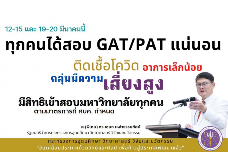 4 กระทรวงร่วมมือกันหาแนวทางเพื่อให้นักเรียนทุกคนมีสิทธิเข้าสอบประจำปี 2565 กระทรวงการอุดมศึกษา วิทยาศาสตร์ วิจัยและนวัตกรรม (อว.)กระทรวงศึกษาธิการ (ศธ.) กระทรวงสาธารณสุข (สธ.) กระทรวงมหาดไทย (มท.) กระทรวงการอุดมศึกษา วิทยาศาสตร์ วิจัยและนวัตกรรม (อว.) และที่ประชุมอธิการบดีแห่งประเทศไทย (ทปอ.) ร่วมหาแนวทางให้นักเรียนที่อยู่ระหว่างการรักษาอาการโควิด-19 มีสิทธิสอบ GAT/PAT ทุกคน ภายใต้มาตรการความปลอดภัยตามมติ ศบค.