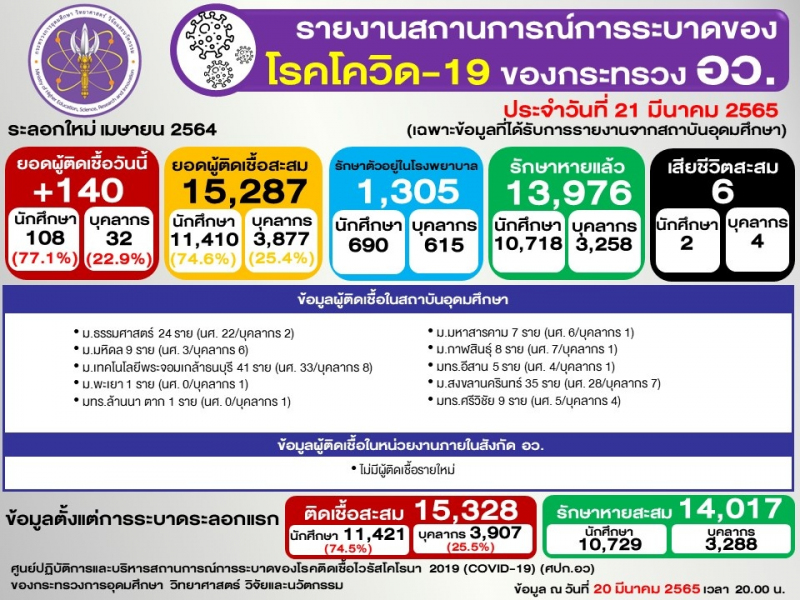 ข้อมูล : ศูนย์ปฏิบัติการและบริหารสถานการณ์การระบาดของโรคติดเชื้อไวรัสโคโรนา 2019 (COVID-19) (ศปก.อว.)