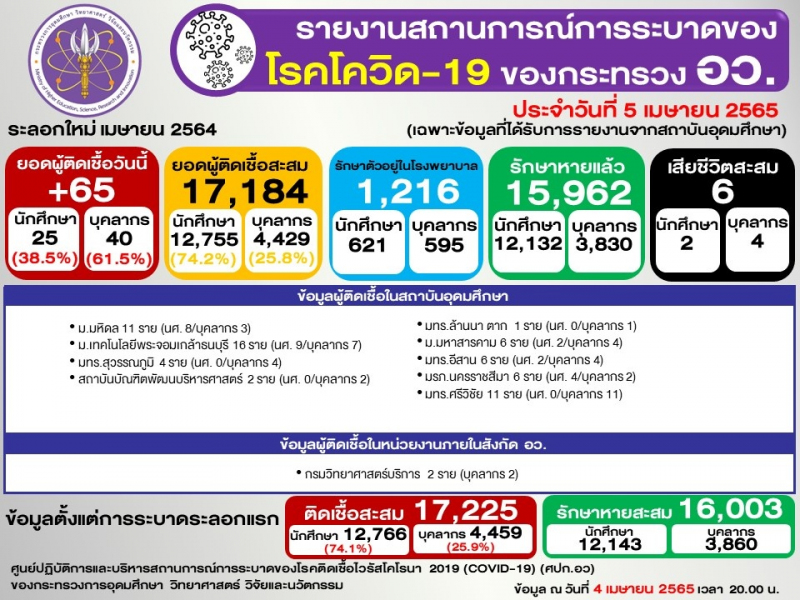 ข้อมูล : ศูนย์ปฏิบัติการและบริหารสถานการณ์การระบาดของโรคติดเชื้อไวรัสโคโรนา 2019 (COVID-19) (ศปก.อว.)