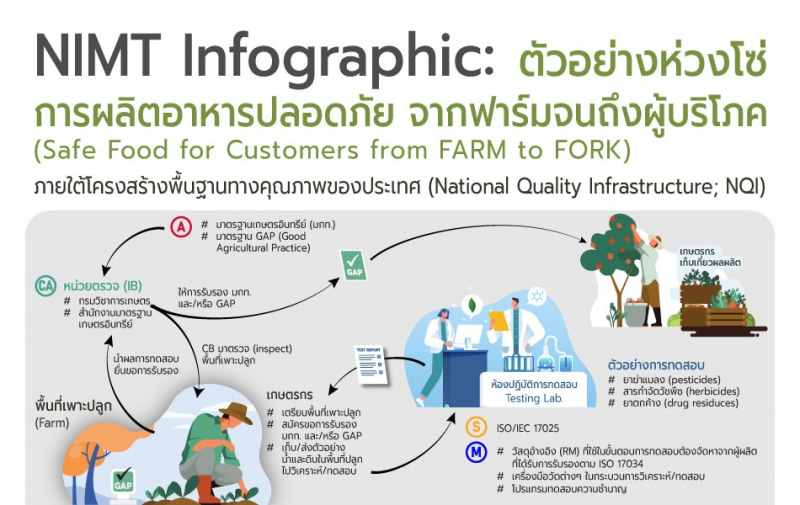 ทั้งนี้ การจะบ่งชี้ให้ได้ว่าผลิตภัณฑ์อาหารที่กำลังผลิตอยู่นั้นเป็นไปตามมาตรฐานหรือไม่ จำเป็นต้องใช้กระบวนการภายใต้โครงสร้างพื้นฐานทางคุณภาพของประเทศ หรือ NQI (National Quality Infrastructure) มาพิจารณา ดังภาพ Infographic ตัวอย่างห่วงโซ่การผลิตอาหารปลอดภัย จากฟาร์มจนถึงผู้บริโภค (Safe Food for Customers from FARM to FORK) จะพบว่าตลอดห่วงโซ่การผลิตอาหารปลอดภัย ถูกกำกับด้วยมาตรฐานและแนวทางปฏิบัติที่เกี่ยวข้องกับความปลอดภัยด้านอาหารในทุกกิจกรรม