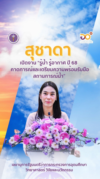 “สุชาดา” เลขา รมว.อว. เปิดเวที "รู้น้ำ รู้อากาศ ปี 68: คาดการณ์และเตรียมพร้อมรับมือสถานการณ์น้ำ" เผยแนวโน้มปริมาณฝนปี 2568 ตอกย้ำ 3 นโยบาย หนุนใช้ระบบข้อมูล-เทคโนโลยีบริหารจัดการน้ำ ลดผลกระทบจากภัยพิบัติ การพัฒนาเทคโนโลยีและระบบข้อมูลเพื่อการคาดการณ์สถานการณ์น้ำที่แม่นยำ ครอบคลุม และตอบสนองความต้องการในระดับพื้นที่ การสร้างความร่วมมือระหว่างหน่วยงานทุกภาคส่วน ทั้งภาครัฐ ภาคเอกชน หน่วยงานท้องถิ่น และมหาวิทยาลัยในพื้นที่ โดยเชื่อมโยงการทำงานกับ "ศูนย์ปฏิบัติการผู้พันวิทย์" เพื่อให้เกิดการตอบสนองที่รวดเร็วและครอบคลุมทุกภูมิภาค การถ่ายทอดองค์ความรู้และพัฒนาบุคลากร เพื่อเสริมสร้างความเข้าใจและทักษะการใช้ข้อมูลน้ำในงานวางแผนและบริหารจัดการทรัพยากรน้ำ