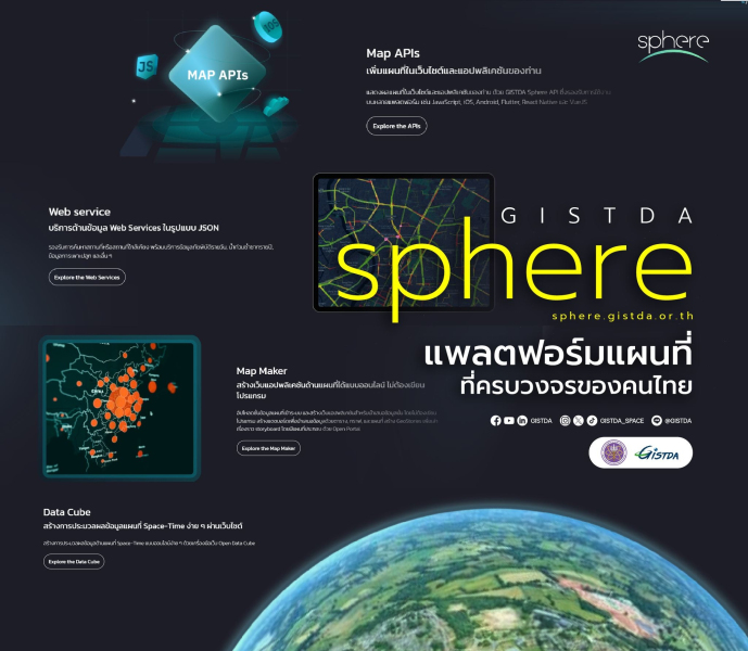 ?สำนักงานพัฒนาเทคโนโลยีอวกาศและภูมิสารสนเทศ (องค์การมหาชน) หรือ GISTDA ซึ่งมีพันธกิจสำคัญในการให้บริการชั้นข้อมูลภาพถ่ายจากดาวเทียมสำหรับการประยุกต์ใช้ประโยชน์ในการบริหารจัดการเชิงพื้นที่ของประเทศไทยได้พัฒนา “GISTDA sphere” ขึ้นเพื่อเป็นแพลตฟอร์มดิจิทัลด้าน “แผนที่” หรือ “ภูมิสารสนเทศ” ที่ครบวงจรของคนไทยพัฒนาโดยคนไทยลดการพึ่งพาเทคโนโลยีของต่างชาติและใช้ข้อมูลที่จัดทำโดยประเทศไทย