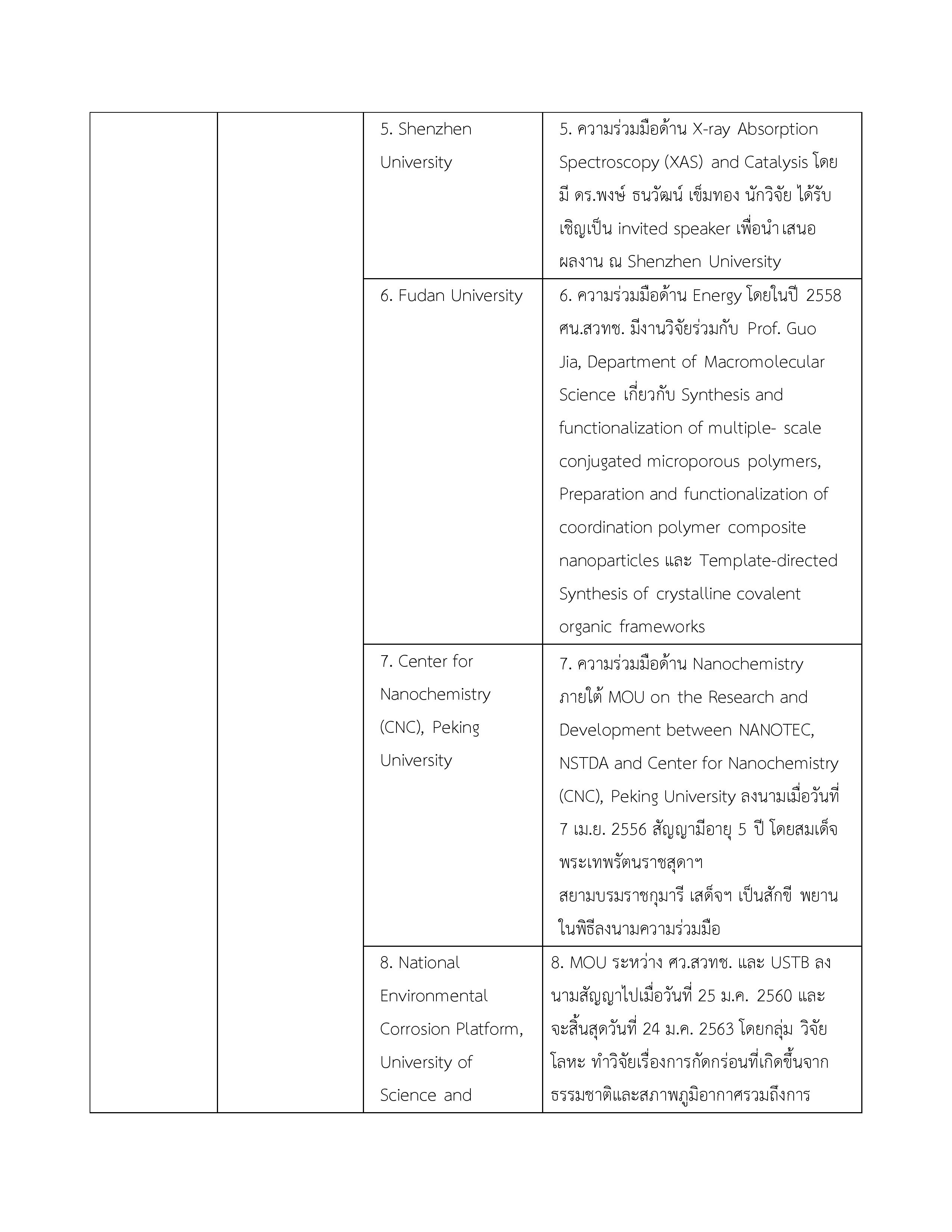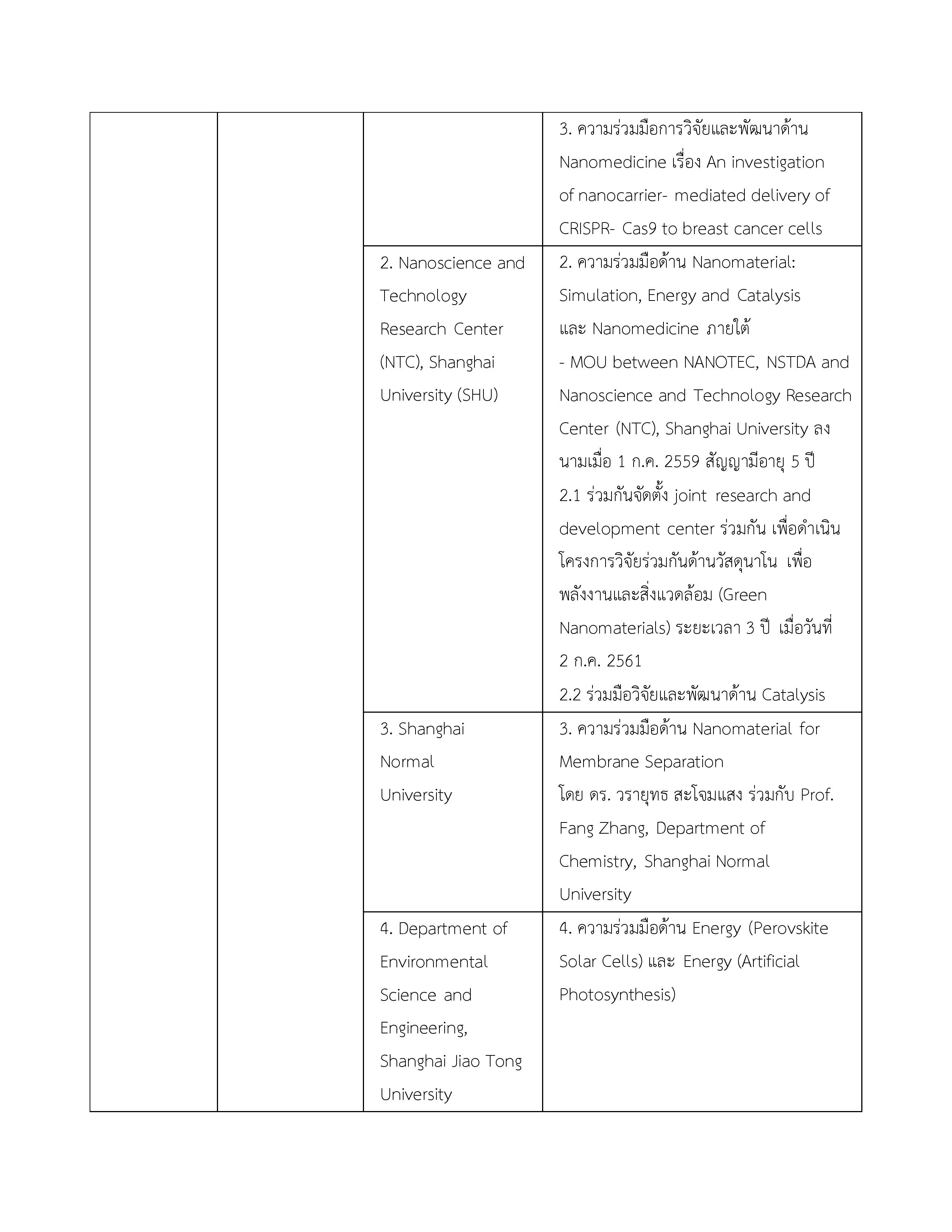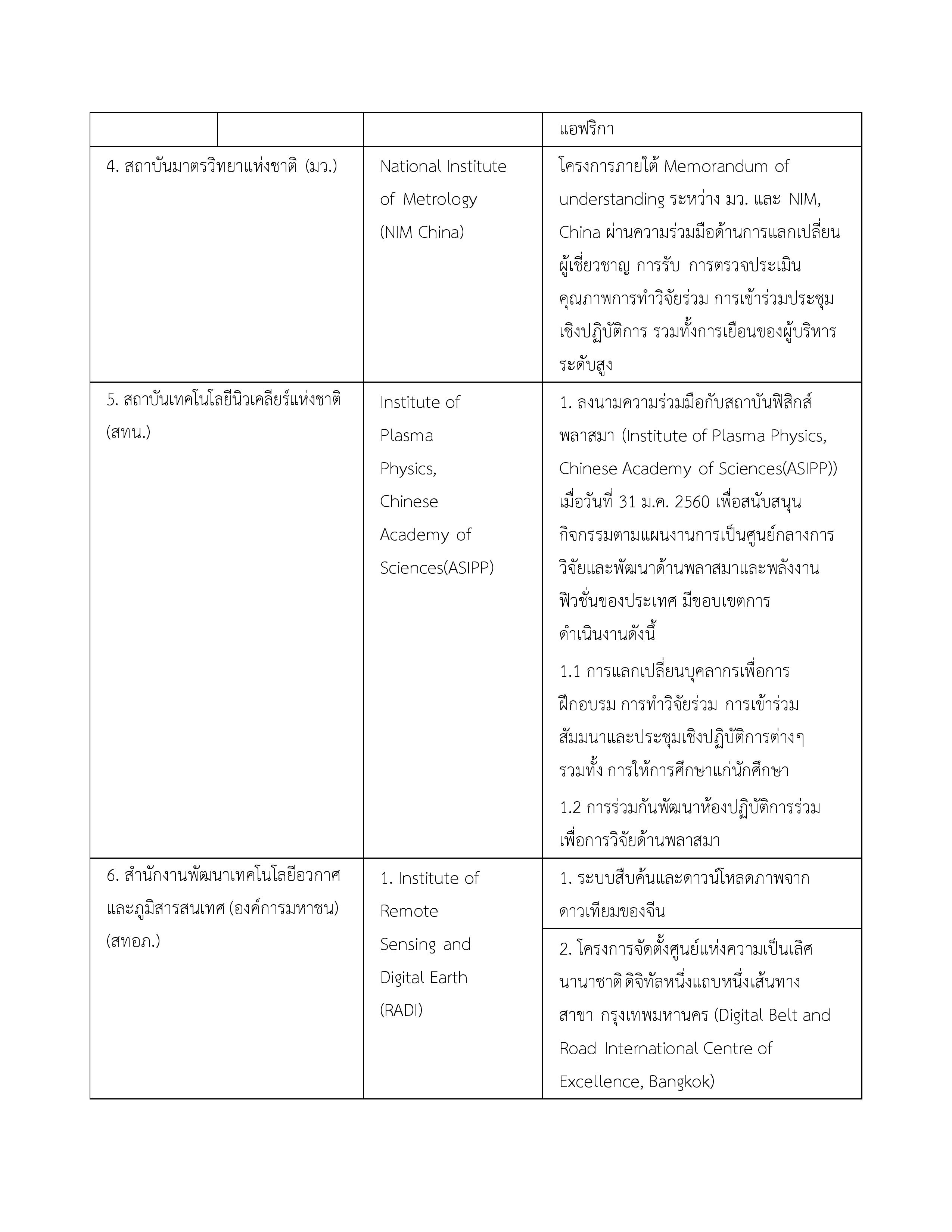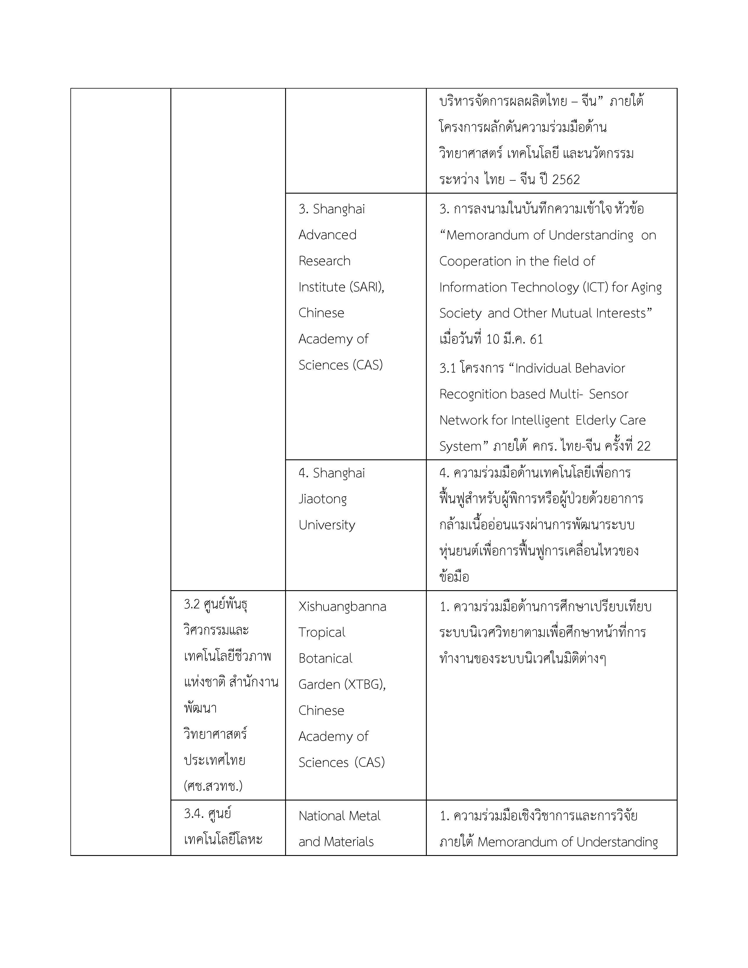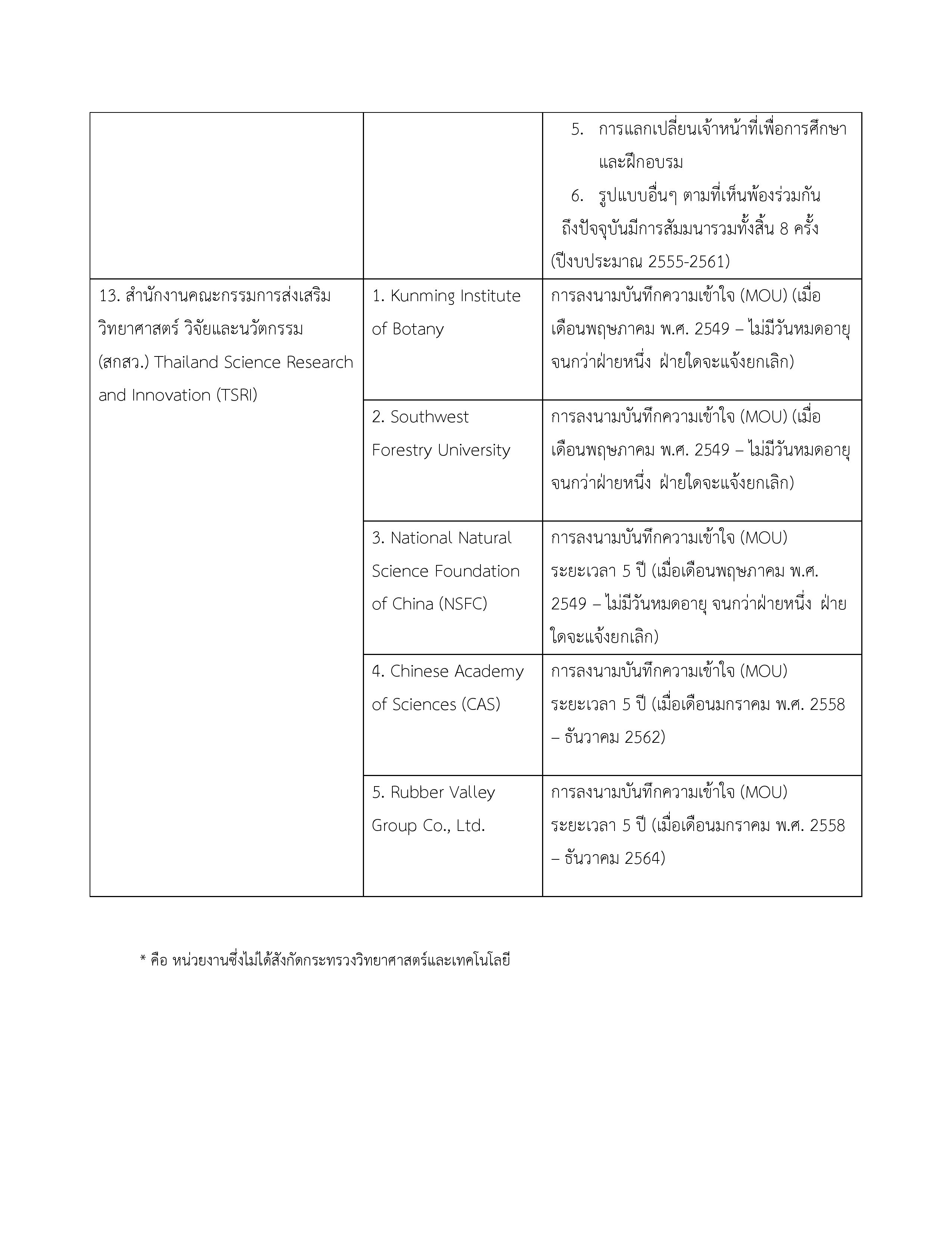 1. ข้อตกลงว่าด้วยการส่งเสริมความร่วมมือใน 4 โครงการระหว่างกระทรวงวิทยาศาสตร์และเทคโนโลยีแห่งราชอาณาจักรไทยกับกระทรวงวิทยาศาสตร์และเทคโนโลยีแห่งสาธารณรัฐประชาชนจีน 11 ตุลาคม 2556 10 ตุลาคม 2561