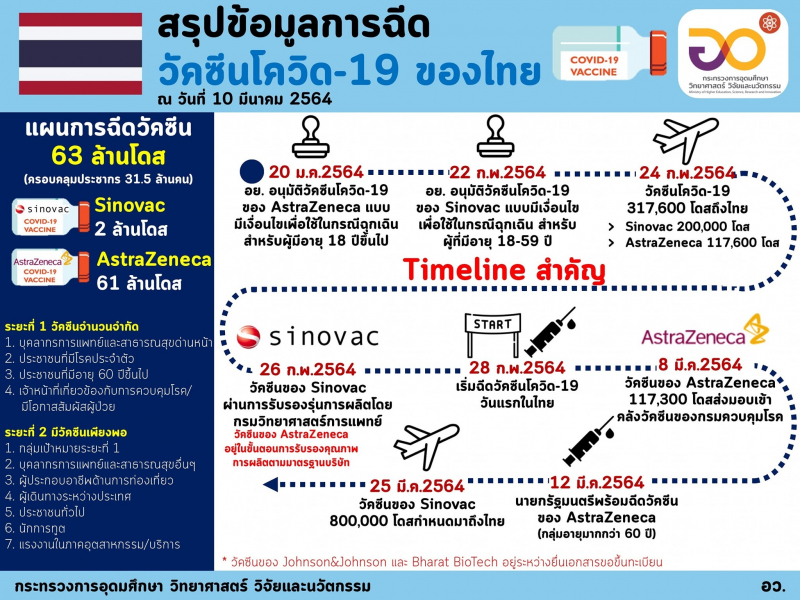 ➡️ (10 มีนาคม 2564) ศาสตราจารย์ ดร. นายแพทย์สิริฤกษ์ ทรงศิวิไล ปลัดกระทรวงการอุดมศึกษา วิทยาศาสตร์ วิจัยและนวัตกรรม (อว.) รายงานว่า กระทรวง อว. ได้ร่วมกับกระทรวงสาธารณสุข ติดตามและประมวลผลการฉีดวัคซีนโควิด-19 ในคนไทยในเชิงรุก โดยสรุปว่า "ขณะนี้ประเทศไทยได้ฉีดวัคซีนโควิด-19 แล้ว จำนวน 33,621 คน ใน 13 จังหวัด ทั้งหมดเป็นวัคซีนของซิโนแวค ผู้ได้รับวัคซีนในระยะแรกนี้ส่วนใหญ่ (76.9%) เป็นบุคลากรการแพทย์/สาธารณสุข/อสม. โดยจังหวัดสมุทรสาครฉีดวัคซีนแล้วจำนวนมากที่สุด ตามด้วยกรุงเทพมหานคร สมุทรปราการ นนทบุรี ชลบุรี ทั้งนี้ผู้ที่ได้รับวัคซีนมากกว่า 91% ไม่มีผลข้างเคียง โดยพบผลข้างเคียงใน 8.88% ของผู้ได้รับวัคซีน แต่อาการไม่รุนแรง"