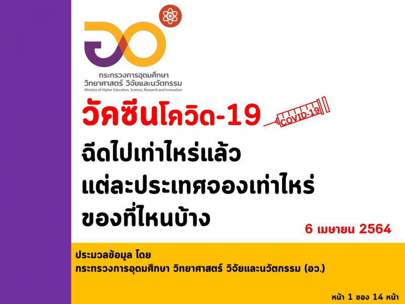 อว. สรุปข้อมูลการฉีดวัคซีนโควิด 673 ล้านโดส ณ วันที่ 6 เมษายน 2564