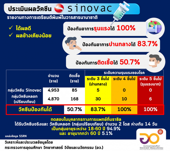 ศาสตราจารย์ ดร. นายแพทย์สิริฤกษ์ ทรงศิวิไล ปลัดกระทรวงการอุดมศึกษา วิทยาศาสตร์ วิจัยและนวัตกรรม (อว.) แจ้งว่าได้มีการรายงานผลการประเมินประสิทธิภาพทางคลินิก ระยะที่ 3 ของวัคซีนซิโนแวค จากประเทศบราซิล พบว่าวัคซีนสามารถป้องกันการเจ็บป่วยรุนแรงและป้องกันการเสียชีวิตได้ 100% สามารถป้องกันการป่วยได้ 83.7% และป้องกันการติดเชื้อได้ 50.7% และมีความปลอดภัยสูงมาก