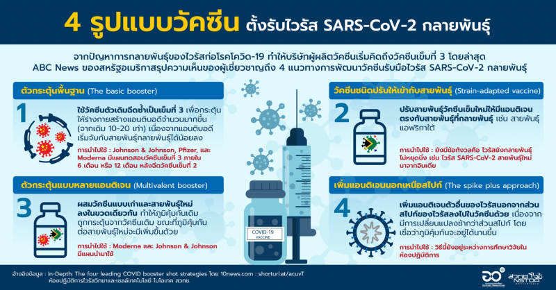 อ้างอิงข้อมูล : In-Depth: The four leading COVID booster shot strategies โดย 10news.com และห้องปฏิบัติการไวรัสและเซลล์เทคโนโลยี ไบโอเทค สวทช.