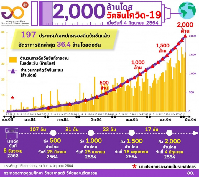 ➡️ (4 มิถุนายน 2564) ศาสตราจารย์ ดร. นายแพทย์สิริฤกษ์ ทรงศิวิไล ปลัดกระทรวงการอุดมศึกษา วิทยาศาสตร์ วิจัยและนวัตกรรม (อว.) เผยว่า "ขณะนี้ได้มีการฉีดวัคซีนโควิด-19 ทั่วโลก รวมกันมากกว่า 2,000 ล้านโดส ใน 197 ประเทศ/เขตปกครอง ภายในเวลาเพียงหกเดือน เร็วที่สุดในประวัติศาสตร์ โดยอัตราการฉีดยังคงรวดเร็วเพิ่มขึ้นอย่างต่อเนื่อง ซึ่ง 500 ล้านโดสล่าสุดใช้เวลาเพียง 17 วันเท่านั้น”