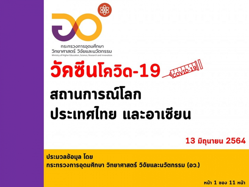 "อว. เผยฉีดวัคซีนของไทย ณ วันที่ 13 มิถุนายน ฉีดวัคซีนแล้ว 6,081,242 โดส และทั่วโลกแล้ว 2,335 ล้านโดส ใน 199 ประเทศ/เขตปกครอง ส่วนอาเซียนฉีดแล้วทุกประเทศ รวมกันกว่า 64.161 ล้านโดส