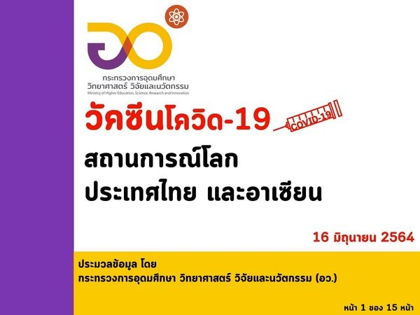 อว. เผยฉีดวัคซีนของไทย ณ วันที่ 16 มิถุนายน ฉีดวัคซีนแล้ว 6,780,8164 โดส และทั่วโลกแล้ว 2,427 ล้านโดส ใน 199 ประเทศ/เขตปกครอง ส่วนอาเซียนฉีดแล้วทุกประเทศ รวมกันกว่า68.182 ล้านโดส โดยจังหวัดของไทยที่ฉีดมากที่สุด คือ จังหวัดภูเก็ต โดยฉีดวัคซีนเข็มแรกกว่า 62.05%"