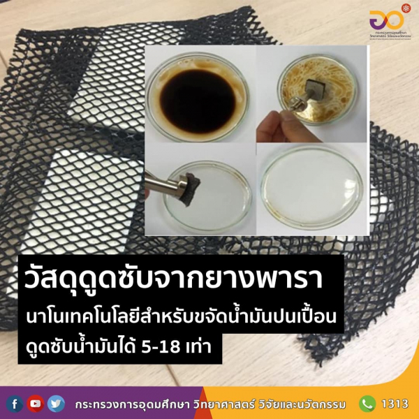 วัสดุดูดซับจากยางพารา นาโนเทคโนโลยีสำหรับขจัดน้ำมันปนเปื้อน ดูดซับน้ำมันได้ 5-18 เท่า ใช้ซ้ำได้อย่างน้อย 5 ครั้ง เป็นมิตรต่อสิ่งแวดล้อม