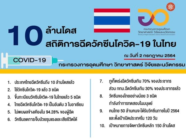 (2 กรกฏาคม 2564) ศาสตราจารย์ ดร. นายแพทย์ สิริฤกษ์ ทรงศิวิไล ปลัดกระทรวงการอุดมศึกษา วิทยาศาสตร์ วิจัยและนวัตกรรม (อว.) เผยว่า ขณะนี้ประเทศไทยได้ฉีดวัคซีนโควิด-19 แล้ว เป็นจำนวนถึง 10,000,000 โดส โดยใช้เวลาเพียง 23 วันในการฉีด 5 ล้านโดสหลังนี้