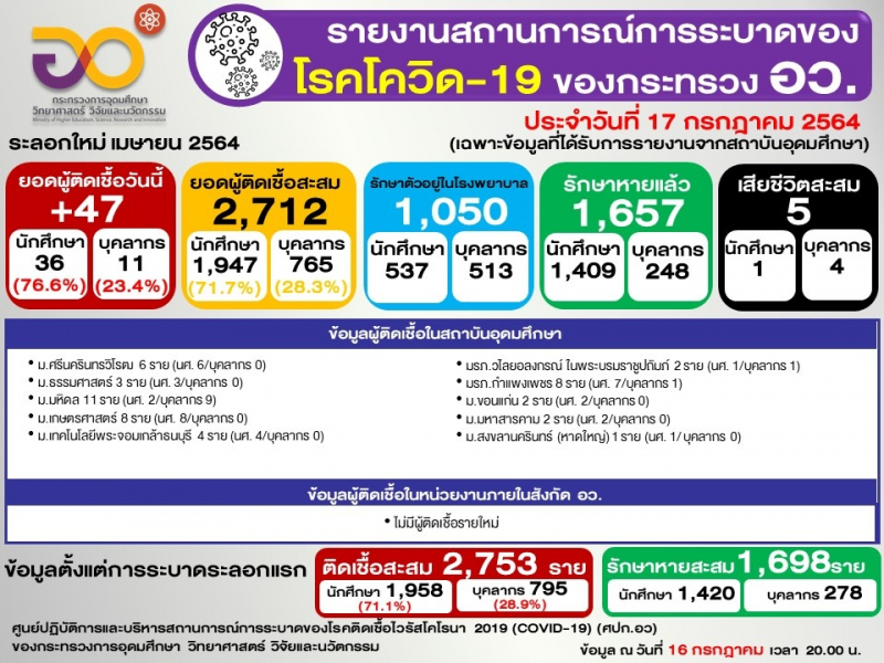 ข้อมูล : ศูนย์ปฏิบัติการและบริหารสถานการณ์การระบาดของโรคติดเชื้อไวรัสโคโรนา 2019 (COVID-19) (ศปก.อว.)