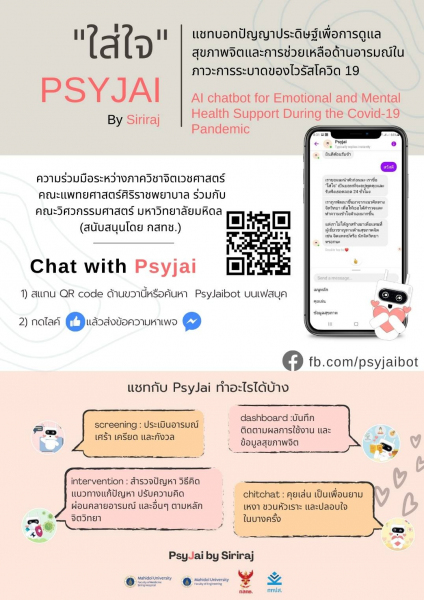 ภาควิชาจิตเวชศาสตร์คณะแพทยศาสตร์ศิริราชพยาบาลร่วมกับคณะวิศวกรรมศาสตร์ มหาวิทยาลัยมหิดล (สนับสนุนโดย กสทช.) ขอเชิญทุกท่านเข้าใช้งานแชทบอทใส่ใจเพื่อดูแลสุขภาพจิตของตนเอง ใช้งานได้ที่ https://www.facebook.com/psyjaibot หรือค้นหา ? “psyjaibot” บนเฟสบุค กดติดตาม และส่งข้อความ (message) หาเพจเพื่อพูดคุยกับแชทบอท