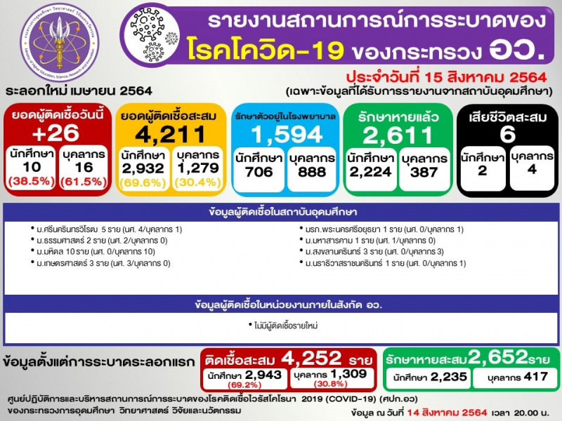 ข้อมูล : ศูนย์ปฏิบัติการและบริหารสถานการณ์การระบาดของโรคติดเชื้อไวรัสโคโรนา 2019 (COVID-19) (ศปก.อว.)