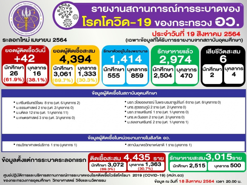 ข้อมูล : ศูนย์ปฏิบัติการและบริหารสถานการณ์การระบาดของโรคติดเชื้อไวรัสโคโรนา 2019 (COVID-19) (ศปก.อว.)