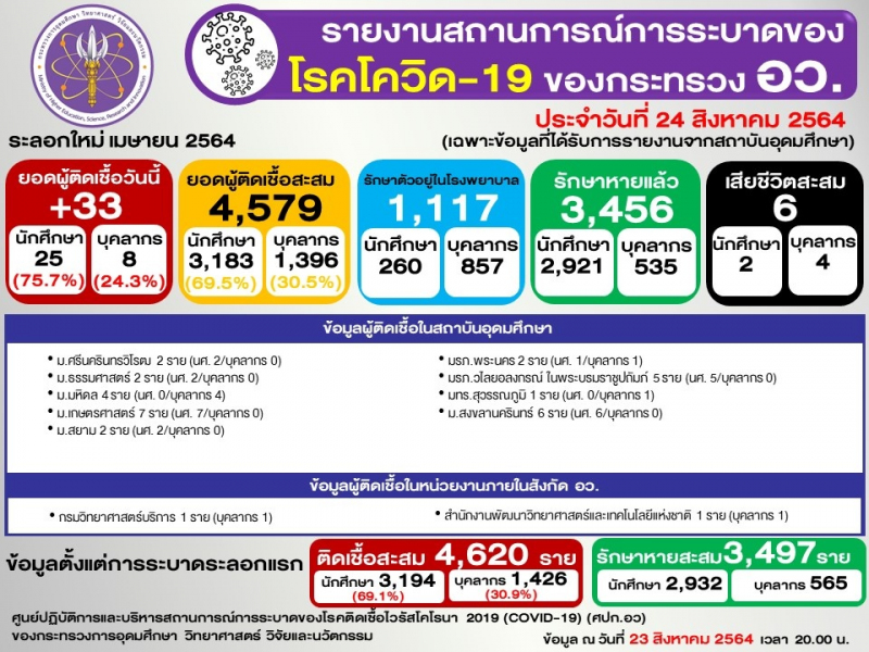 รายงานสถานการณ์การระบาดของโรค COVID-19 ของกระทรวง อว. (24 ส.ค. 64)
