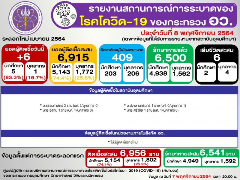 ข้อมูล : ศูนย์ปฏิบัติการและบริหารสถานการณ์การระบาดของโรคติดเชื้อไวรัสโคโรนา 2019 (COVID-19) (ศปก.อว.)