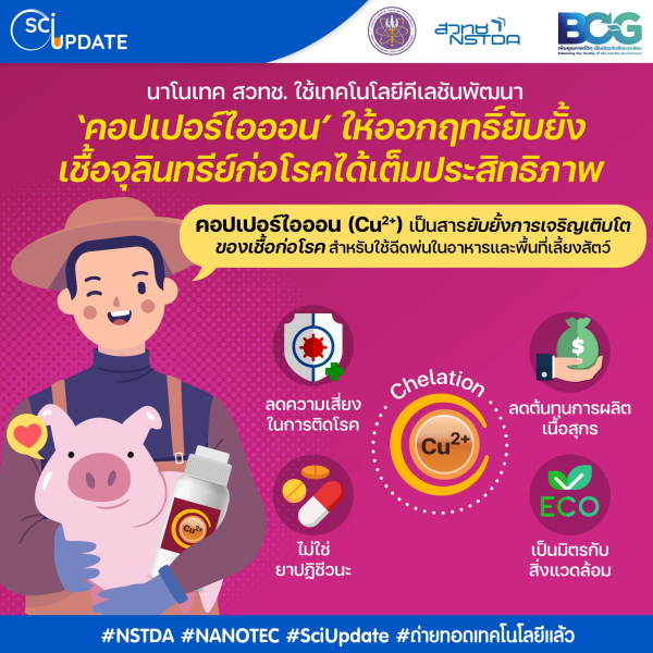 นักวิจัยนาโนเทค สวทช. ไม่นิ่งนอนใจ นำความเชี่ยวชาญด้านเทคโนโลยีคีเลชัน (Chelation technology) พัฒนา 'สารคอปเปอร์ไอออน' หรือสารยับยั้งการเจริญเติบโตของเชื้อก่อโรค ทั้งแบคทีเรียแกรมบวกและลบรวมถึงไวรัสที่มีการใช้งานกับอาหารและพื้นที่เพาะเลี้ยงสุกร ให้อยู่ในรูปที่สามารถออกฤทธิ์ยับยั้งการเจริญเติบโตของเชื้อก่อโรคได้อย่างมีประสิทธิภาพในสภาพแวดล้อมจริง