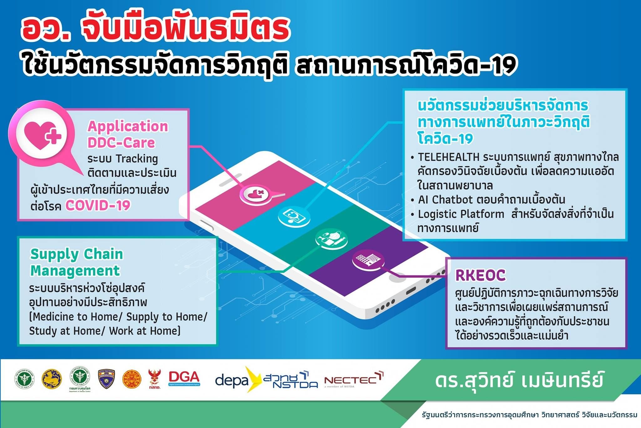 1. การใช้ระบบ Tracking เพื่อติดตามผู้เดินทางเข้าประเทศซึ่งมาจากประเทศกลุ่มเสี่ยงและเฝ้าระวัง ด้วยแพลตฟอร์ม DDC-care : พัฒนาโดย สำนักงานพัฒนาวิทยาศาสตร์และเทคโนโลยีแห่งชาติ (สวทช.) ซึ่งเป็นความร่วมมือระหว่างกรมควบคุมโรค สำนักงานตรวจคนเข้าเมือง สำนักงานพัฒนารัฐบาลอิเลกทรอนิกส์ มหาวิทยาลัยธรรมศาสตร์ สำนักงานส่งเสริมเศรษฐกิจดิจิทัล และ กลุ่มสตาร์ทอัพ โดยจะเป็นระบบติดตามและประเมินผู้ที่มีความเสี่ยงต่อโรค เพื่อติดตามและประเมินสุขภาพผู้ที่เดินทางเข้าประเทศ ซึ่งมาจากประเทศกลุ่มเสี่ยงและต้องกักตัวเองภายในที่อยู่อาศัยเป็นเวลา 14 วัน ซึ่งกรมควบคุมโรคจะประเมินความเสี่ยงจากข้อมูลสุขภาพที่ได้จากระบบ เพื่อให้คำแนะนำและข่วยเหลือได้ทันท่วงทีเมื่อมีอาการ