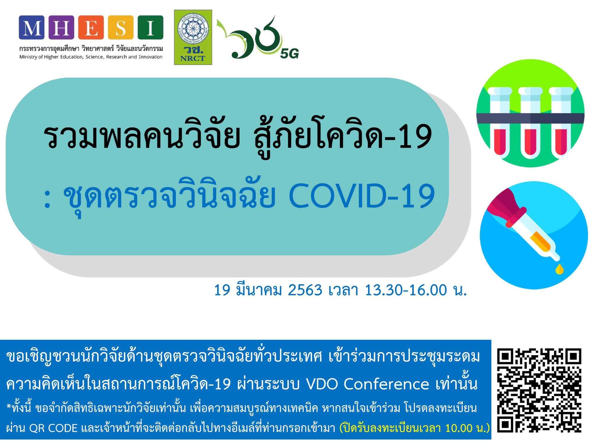 ขอเชิญชวนนักวิจัยนักวิจัยด้านชุดตรวจวินิจฉัยทั่วประเทศ เข้าร่วมการประชุมระดมความคิดเห็นในสถานการณ์โควิด-19ผ่านระบบ VDO Conference เท่านั้น