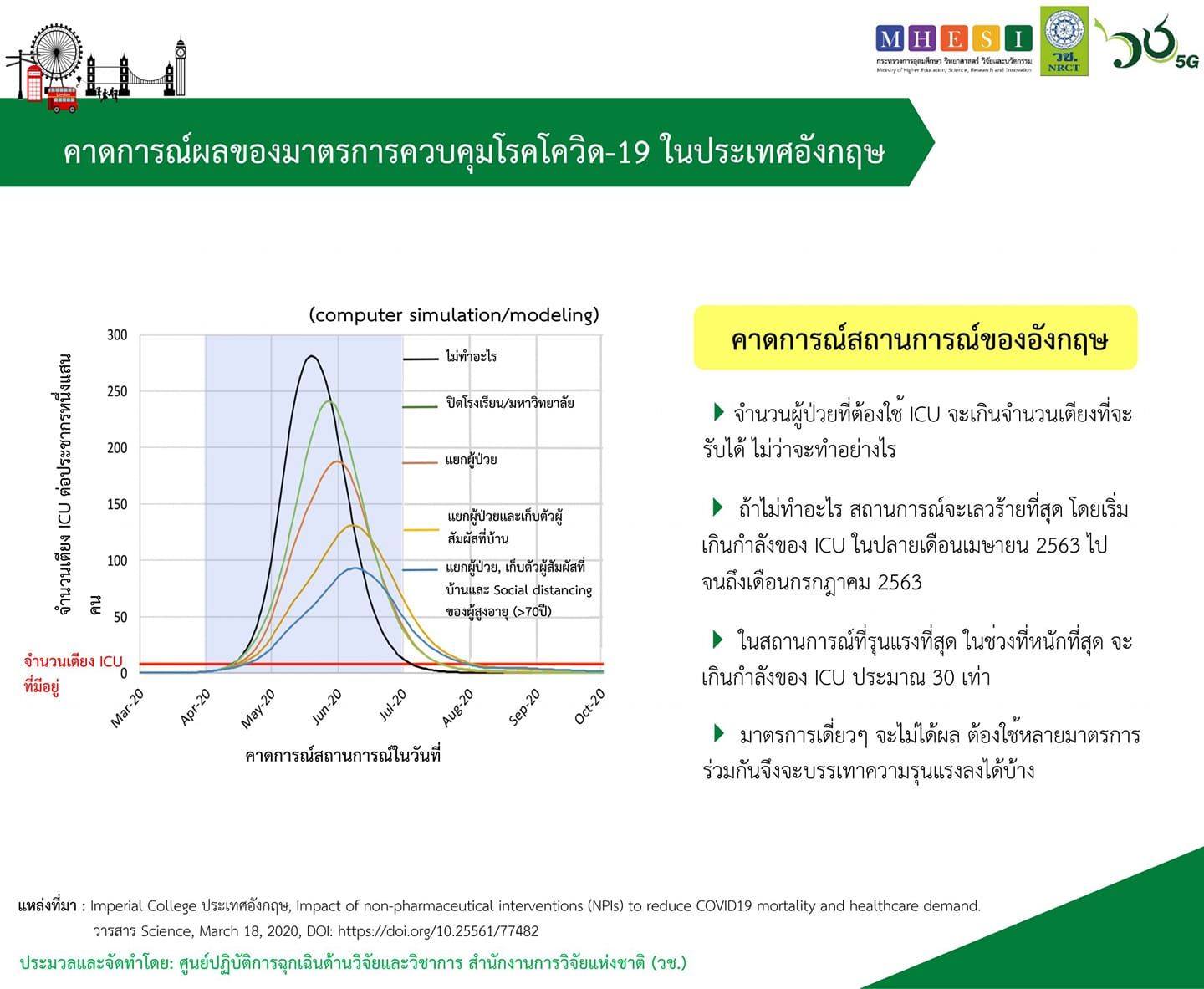 นักวิจัยของศูนย์ปฏิบัติการฉุกเฉินด้านวิจัยและวิชาการ ของ วช. กระทรวงการอุดมศึกษาฯ พบว่าการคาดการณ์ว่ามาตรการต่างๆที่จะใช้ในการควบคุมการระบาดของโรคโควิด-19 ของประเทศอังกฤษ จะมีผลอย่างไร โดยใช้แบบจำลองทางคณิตศาสตร์คาดการณ์ว่าจะมีผู้ป่วยจำนวนมากน้อยเท่าไหร่และในสัปดาห์ไหน แล้วเอามาเทียบกับจำนวนเตียงของไอซียูที่จะเอามารักษาผู้ป่วยหนักได้ ว่าจะเพียงพอหรือไม่อย่างไร