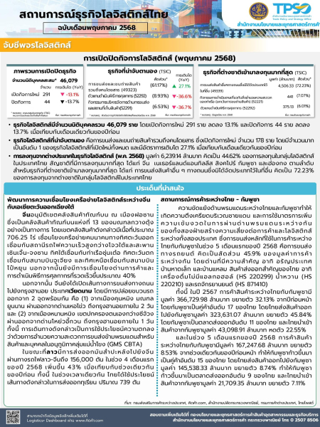สถานการณ์ธุรกิจโลจิสติกส์ไทย ฉบับเดือนพฤษภาคม 2568 สำนักงานนโยบายและยุทธศาสตร์การค้า (สนค.)