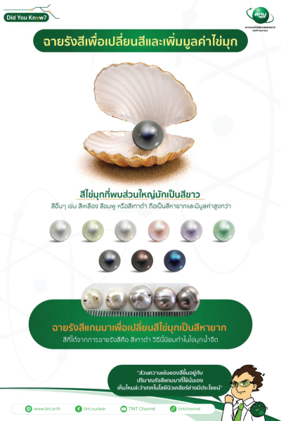 หลายคนอาจจะคิดว่าการฉายรังสีเพื่อปรับสมบัติของอัญมณีทำให้มีสีสรรที่สวยงามขึ้น อาจจะทำได้เพียงกับพลอยเนื้ออ่อนเท่านั้น ซึ่งที่จริงแล้วยังมีอัญมณีอีกหลายประเภทที่สามารถนำมาฉายรังสีได้ อย่างไข่มุกธรรมชาติซึ่งปรกติมีสีขาววาวๆ แต่ถ้าได้พบไข่มุกสีดำ สีเทา สีชมพู ในธรรมชาติก็จะเป็นที่ต้องการของตลาดและมีราคาสูง เนื่องจากหายากมาก แต่ปัจจุบันสามารถนำการฉายรังสีมาทำให้ไข่มุกมีสีสรรที่เปลี่ยนไป และเป็นที่ต้องการของตลาดมากขึ้น แถมราคาของไข่มูกก็สูงขึ้นตามไปด้วย