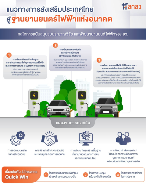 จึงเป็นที่มาของ การจัดทำแผนของ สกสว. แผนด้านวิทยาศาสตร์ วิจัยและนวัตกรรม (ด้าน ววน.) ควบคู่กับจัดสรรงบประมาณด้าน ววน. ผ่านกองทุนส่งเสริมวิทยาศาสตร์วิจัยและนวัตกรรม (กองทุน ววน.) ดําเนินงานตาม แผนงานตามจุดมุ่งเน้นสําคัญ (Flagship) ในแผนด้าน ววน. (F6 (S 1P7)) เร่งพัฒนาอุตสาหกรรมยานยนต์ไฟฟ้า และเทคโนโลยีเกี่ยวเนื่อง ให้ประเทศไทยเป็นศูนย์กลางการผลิตของอาเซียน โดยการสนับสนุนและส่งเสริมการพัฒนาและยกระดับโครงสร้างพื้นฐาน สําหรับใช้ในการทําวิจัยและ พัฒนาเทคโนโลยี เช่น สนามทดสอบ การทดสอบแบตเตอรี่ มอเตอร์ หรือระบบซอฟต์แวร์ต่างๆ ที่นอกจากจะทดสอบเพื่อการวิจัยแล้ว ยังทดสอบเพื่อการพัฒนาให้ได้มาตรฐานโลก