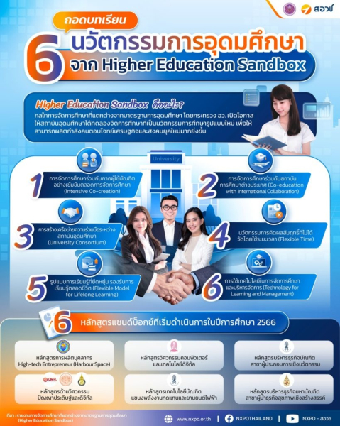 โดยทั้ง 6 นวัตกรรมข้างต้น ได้ถอดบทเรียนมาจาก 6 หลักสูตรแซนด์บ็อกซ์ ที่เริ่มดำเนินการในปีการศึกษา 2566 ประกอบด้วย หลักสูตรการผลิตบุคลากร High-tech Entrepreneur (Harbour.Space) มหาวิทยาลัยหอการค้าไทย / หลักสูตรด้านวิศวกรรมปัญญาประดิษฐ์และดิจิทัล มหาวิทยาลัยซีเอ็มเคแอล และมหาวิทยาลัยเครือข่าย / หลักสูตรวิศวกรรมคอมพิวเตอร์และเทคโนโลยีดิจิทัล จุฬาลงกรณ์มหาวิทยาลัย / หลักสูตรเทคโนโลยีบัณฑิต แขนงพลังงานทดแทนและยานยนต์ไฟฟ้า สถาบันเทคโนโลยีจิตรลดา / หลักสูตรบริหารธุรกิจบัณฑิต สาขาผู้ประกอบการเชิงนวัตกรรม สถาบันเทคโนโลยีจิตรลดา และ หลักสูตรบริหารธุรกิจมหาบัณฑิต สาขาผู้นำธุรกิจสุขภาพเชิงสร้างสรรค์ มหาวิทยาลัยแม่ฟ้าหลวง ซึ่งทั้งหมดนี้คือการเปลี่ยนแปลงครั้งสำคัญที่จะช่วยให้การอุดมศึกษาไทยก้าวทันโลก