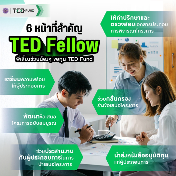 ติดต่อเป็น TED Fellow ที่ กองทุนพัฒนาผู้ประกอบการเทคโนโลยีและนวัตกรรม (ฝ่ายพัฒนาโครงการ โดย งานพัฒนาธุรกิจ) ? โทร. 02-333-3700 ต่อ 4073