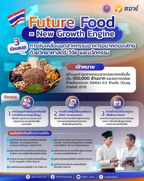 สอวช. ได้จัดทำ “ข้อเสนอการขับเคลื่อนอุตสาหกรรมอาหารอนาคตของประเทศไทย ด้วยวิทยาศาสตร์ วิจัยและนวัตกรรม” โดยมีวัตถุประสงค์เพื่อนำวิทยาศาสตร์ วิจัยและนวัตกรรม เข้าไปสนับสนุนการปรับเปลี่ยนโครงสร้างการผลิตและส่งออกเกษตรอาหารของไทย ให้มีสัดส่วนของสินค้าที่ตอบสนองกับความต้องการของตลาดในอนาคตเพิ่มขึ้น ยกระดับความสามารถทางเทคโนโลยีและกลายเป็นเครื่องยนต์ใหม่ที่สำคัญของอุตสาหกรรมเกษตรอาหารไทย โดยมีเป้าหมายสำคัญ คือ เพิ่มมูลค่าอุตสาหกรรมอาหารอนาคตขึ้นเป็น 500,000 ล้านบาท และลดการปล่อยก๊าซเรือนกระจก (GHGs) 0.3 ล้านตัน CO₂e ภายในปี 2570 โดยมีข้อเสนอ 3 ประเด็น ดังนี้