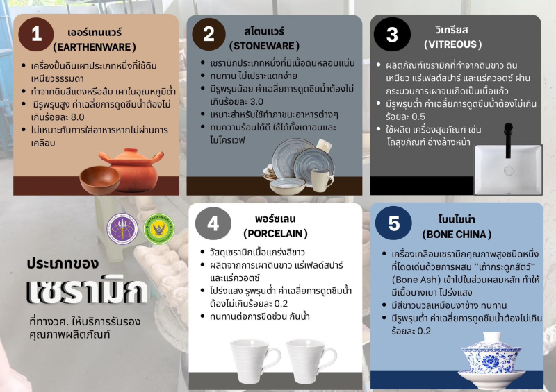 ​       เซรามิกที่ใช้กับอาหารซึ่ง กรมวิทยาศาสตร์บริการให้การรับรอง สามารถแบ่งออกเป็นหลายประเภทตามลักษณะการใช้งานและคุณสมบัติของวัสดุ โดยแต่ละประเภทผ่านการทดสอบด้านความปลอดภัย การละลายของสารโลหะหนัก และความเหมาะสมต่อการสัมผัสอาหาร เพื่อสร้างความมั่นใจให้ผู้บริโภคและผู้ประกอบการ ดังนี้